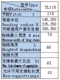TL115II型鋼制拖鏈:簡介:節(jié)距115mm,彎曲半徑有145,200,225,250,300.鏈板高度86mm,拖鏈最大孔徑63mm